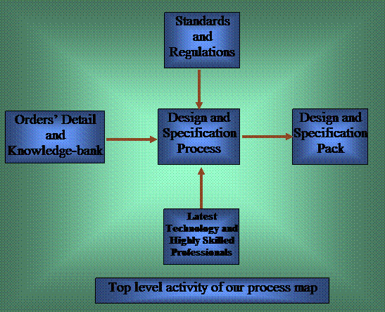 Our process high-level activity shown below depicts that: We take client orders’ detail and our knowledge-bank as an input for the design and specification process. We use up-to-date standards and regulations as the process control. We deploy latest technology and employ highly skilled professionals as the process mechanism. In the end of such process, we deliver to our client a rich design and specification pack as the process output.